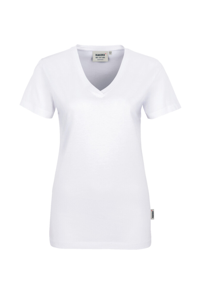 Klassisches T-Shirt für Damen, mit feminin geschnittenem V-Ausschnitt, modisch schmalem Halsbündchen und Nackenband. Hergestellt aus feinem, mittelschwerem Single-Jersey aus langstapeliger, gekämmter und ringgesponnener CmiA-Baumwolle. Gewebtes HAKRO Necklabel aus hochwertigem Kettsatin mit weichen, ultraschallgeschnittenen Bandkanten für höchsten Tragekomfort und gewebtes HAKRO Flaglabel an der linken Seitennaht.