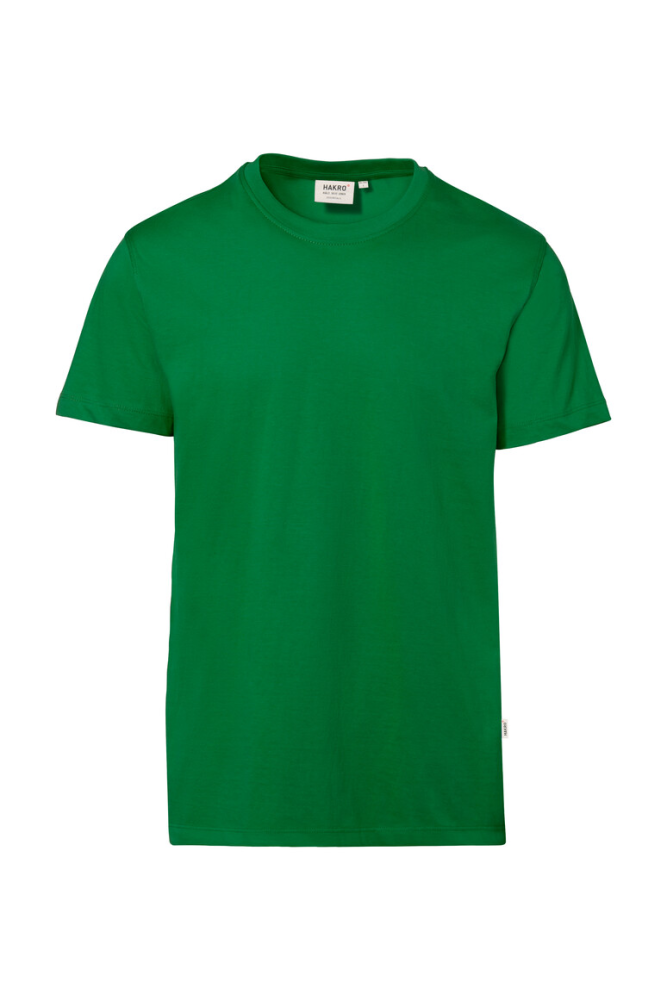 Klassisches T-Shirt mit rundem Halsausschnitt, LYCRA®-verstärktem Halsbündchen und Nackenband. Hergestellt aus feinem, mittelschwerem Single-Jersey aus langstapeliger, gekämmter und ringgesponnener CmiA-Baumwolle. Gewebtes HAKRO Necklabel aus hochwertigem Kettsatin mit weichen, ultraschallgeschnittenen Bandkanten für höchsten Tragekomfort und gewebtes HAKRO Flaglabel an der linken Seitennaht.